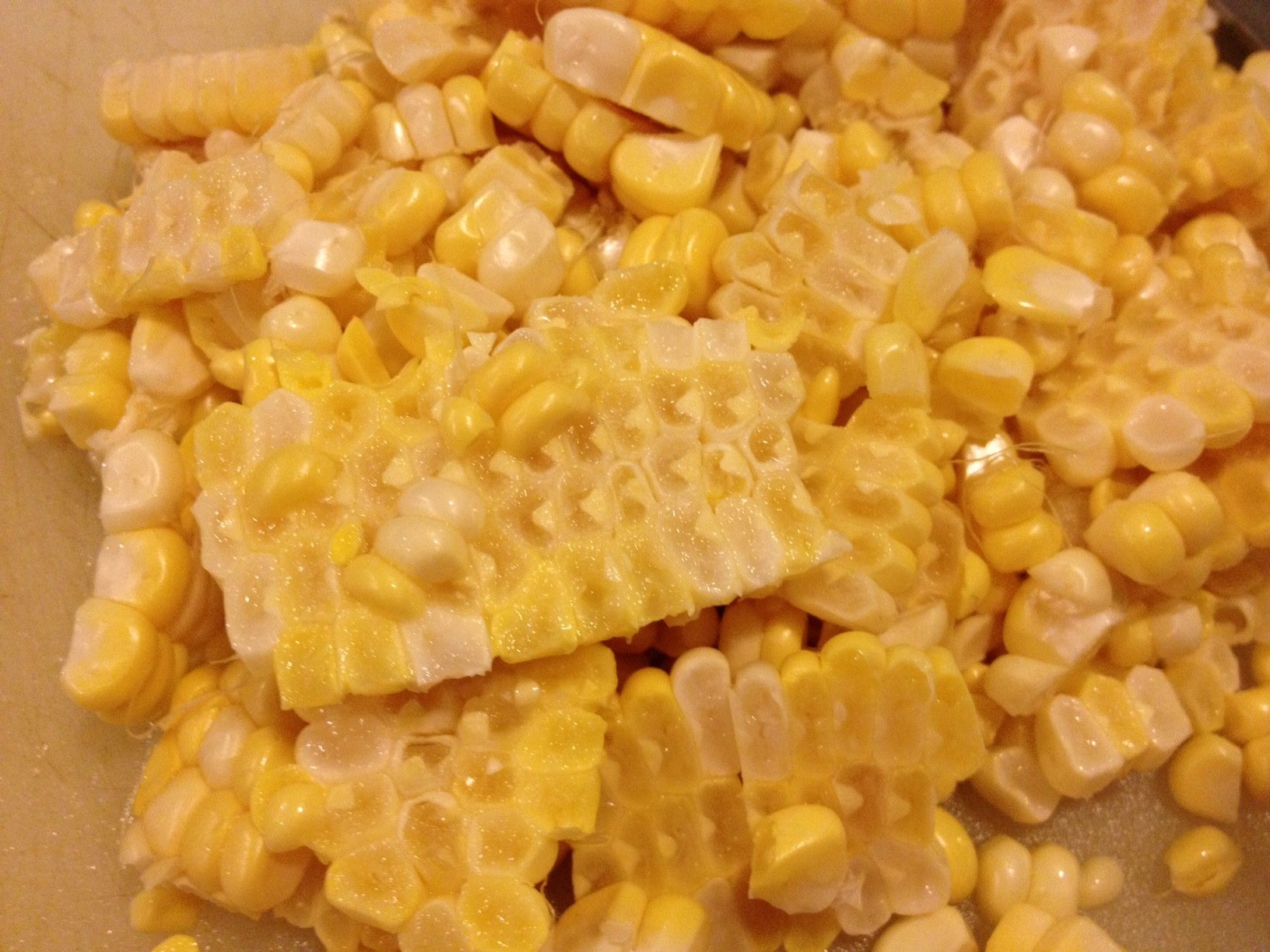 Tip: For an easy way to cut the corn off the cob, I like to cut my cobs in half. Then, place the corn cut-side down on the cutting board. This gives you a flat surface and helps keep the corn from moving while you cut the kernels off.