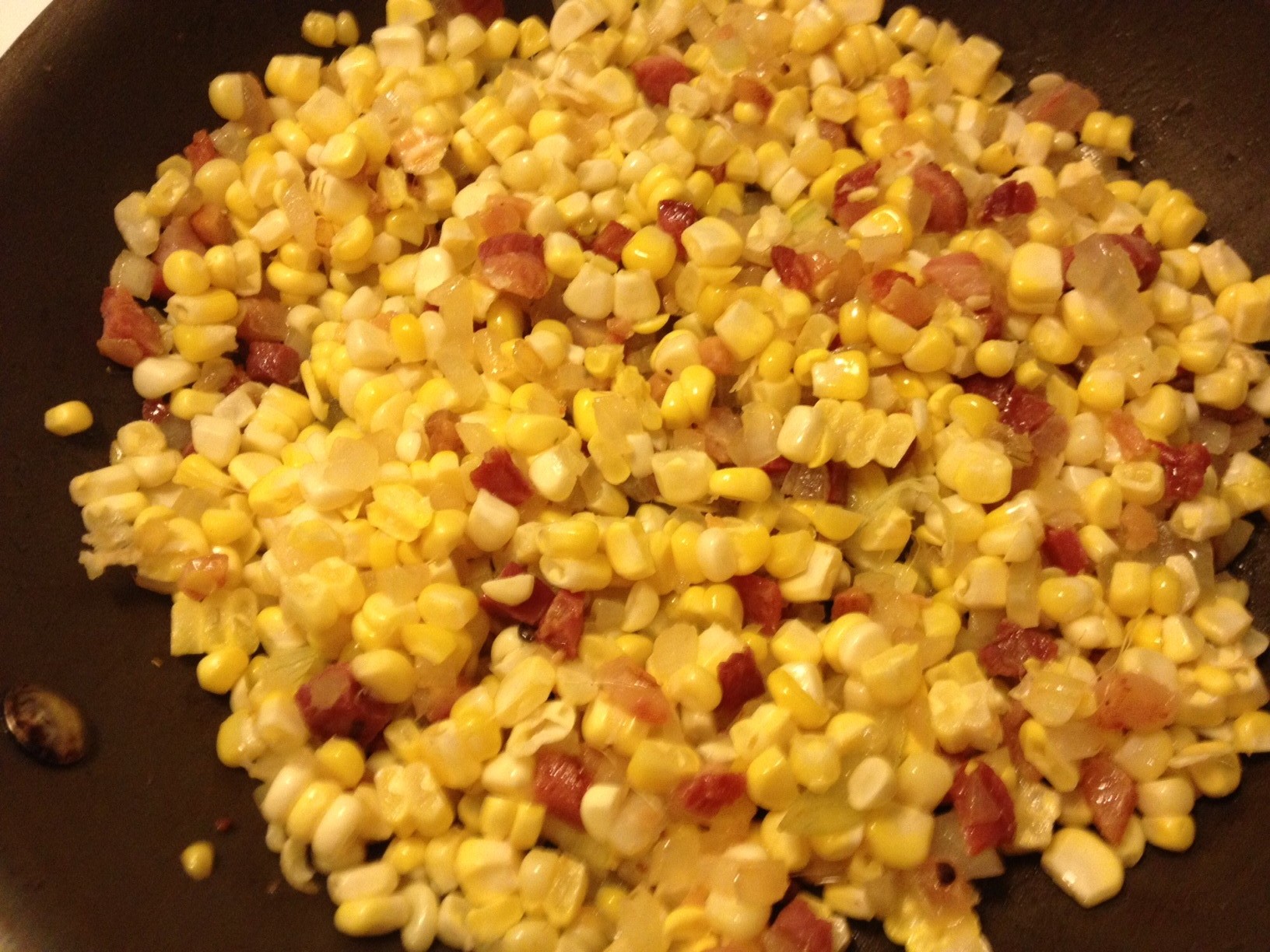 Drain excess grease out of pancetta pan. Add onion and corn to pan. Cook for 5 minutes, or until onion is translucent and corn is cooked through.