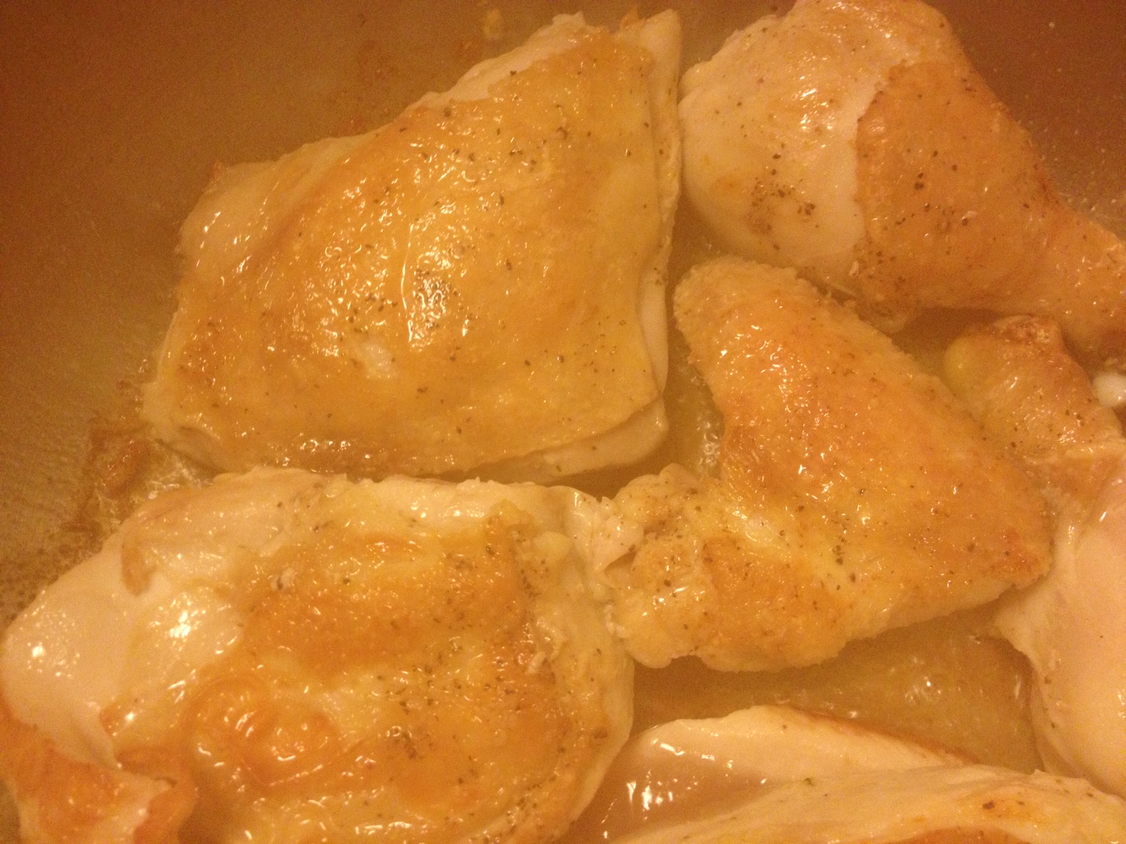 Place the chicken skin-side down and let cook in the hot oil and butter for six minutes.