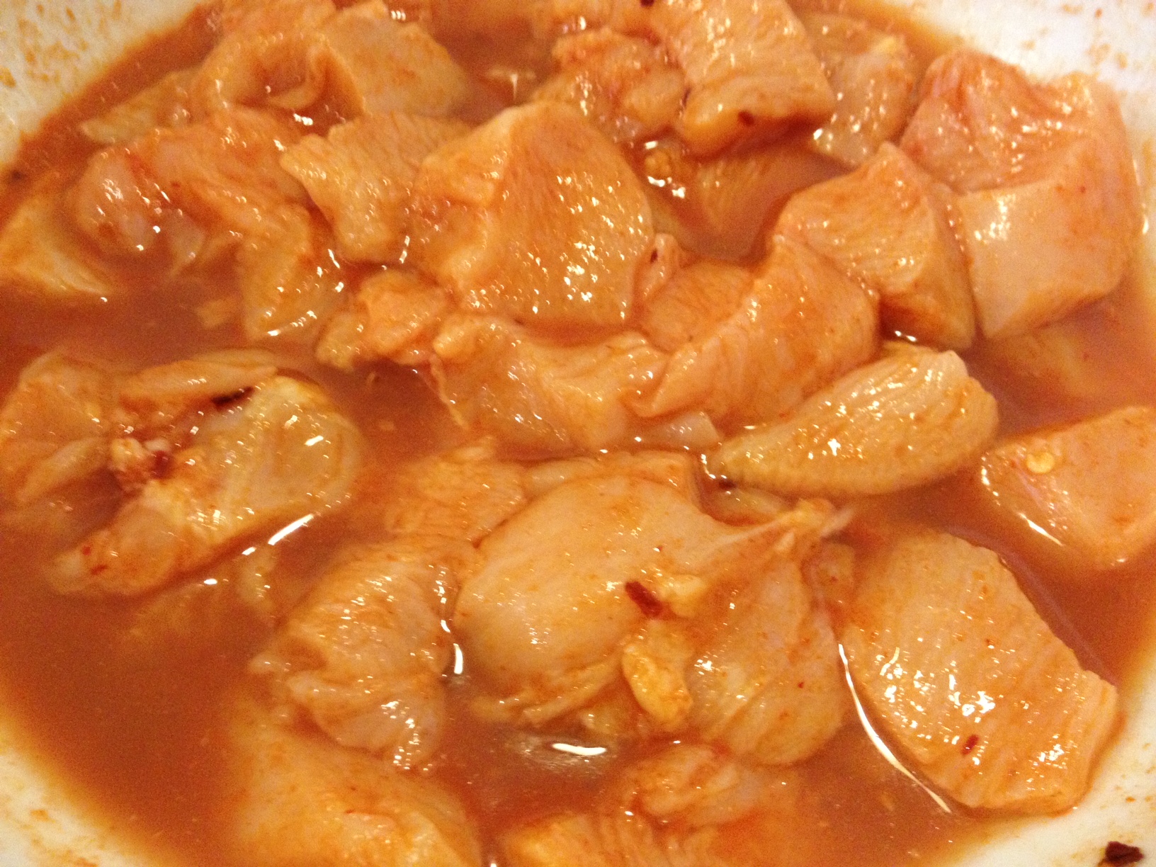 First step will be to cut the chicken into bite size pieces. Mix all the marinade items together in a large bowl. Add chicken to this liquid and let marinate for at least 15 minutes.