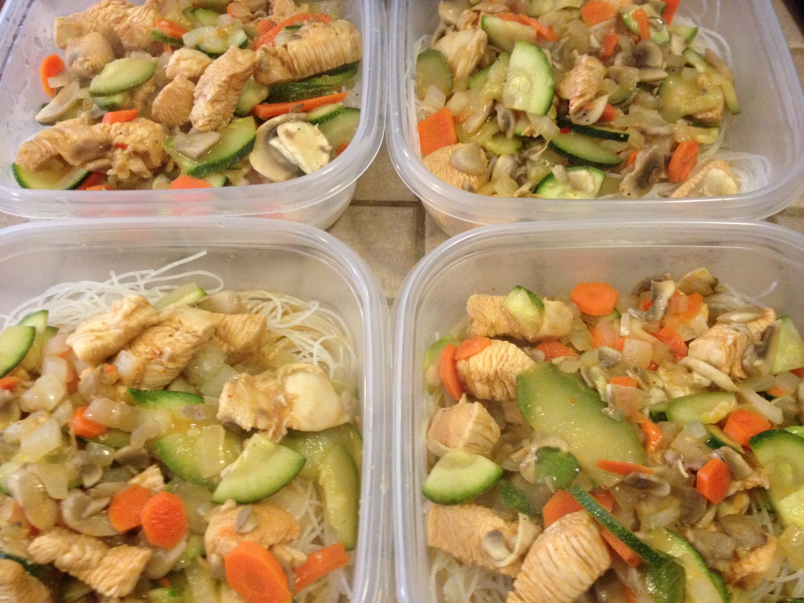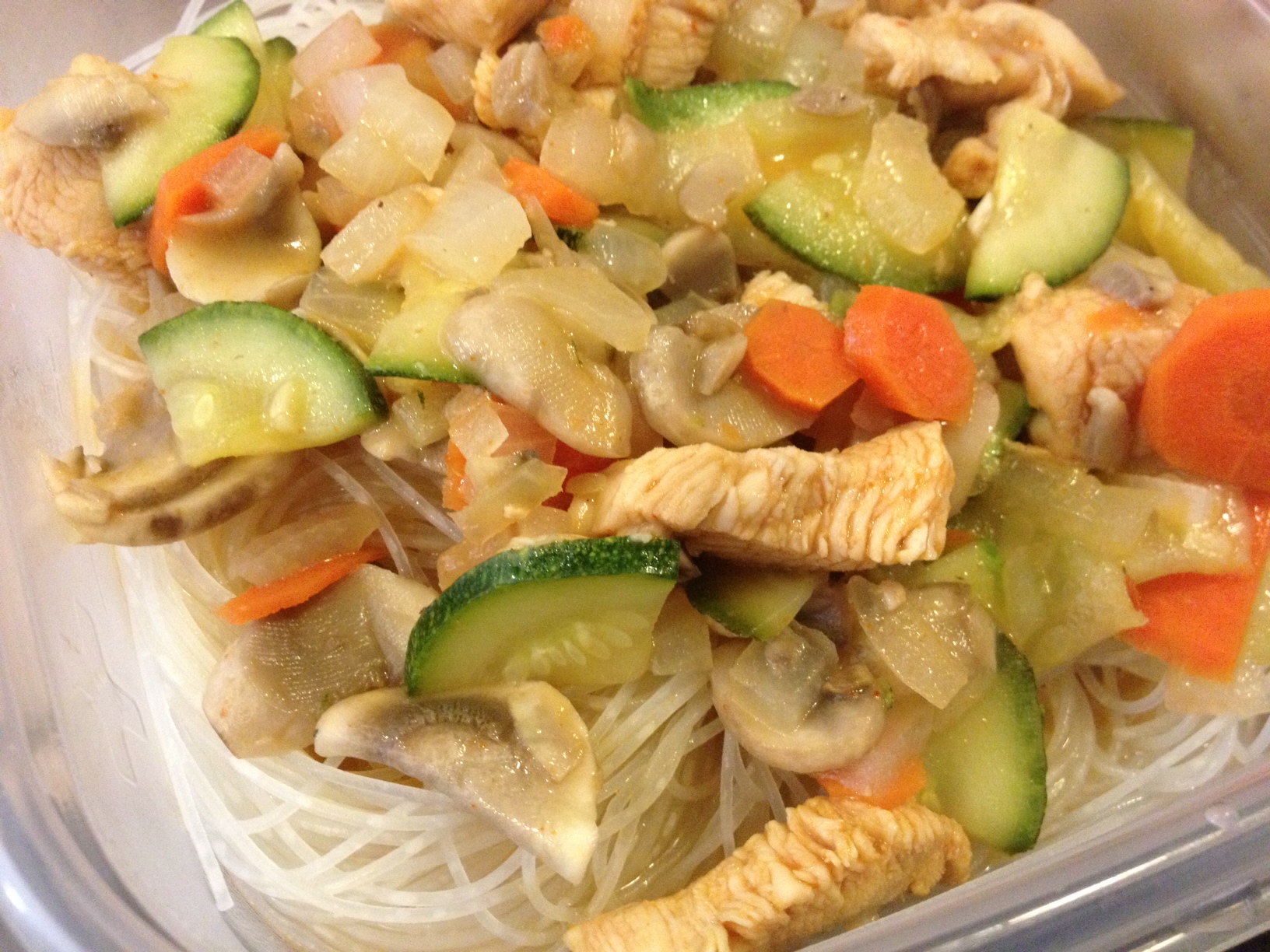 Divide the rice noodles among the plates and top with the chicken, veggies and curry sauce.
